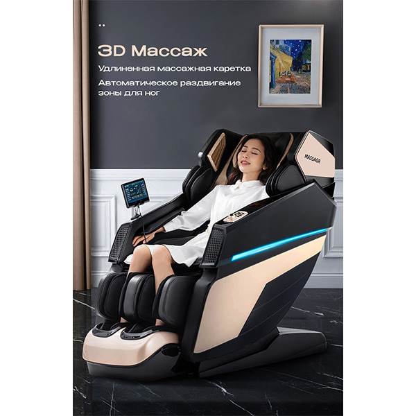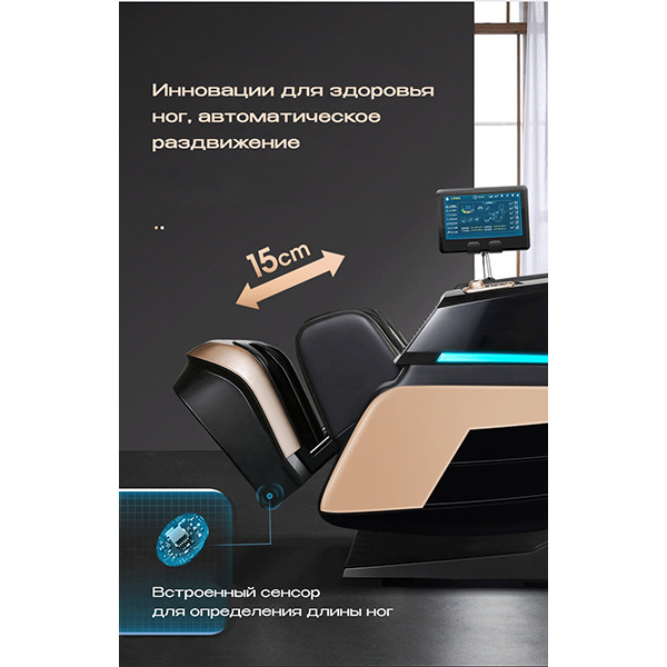 Сердце модели — 3D-массажный блок, который точно следует анатомии позвоночника и позволяет регулировать глубину и интенсивность массажа в реальном времени. Благодаря рекордной для линейки длине каретки — 1490 мм, кресло охватывает зону от шеи до копчика, обеспечивая полное покрытие даже для высоких пользователей. 20 пневматических подушек дополняют сеанс, бережно прорабатывая руки, бёдра и икры.